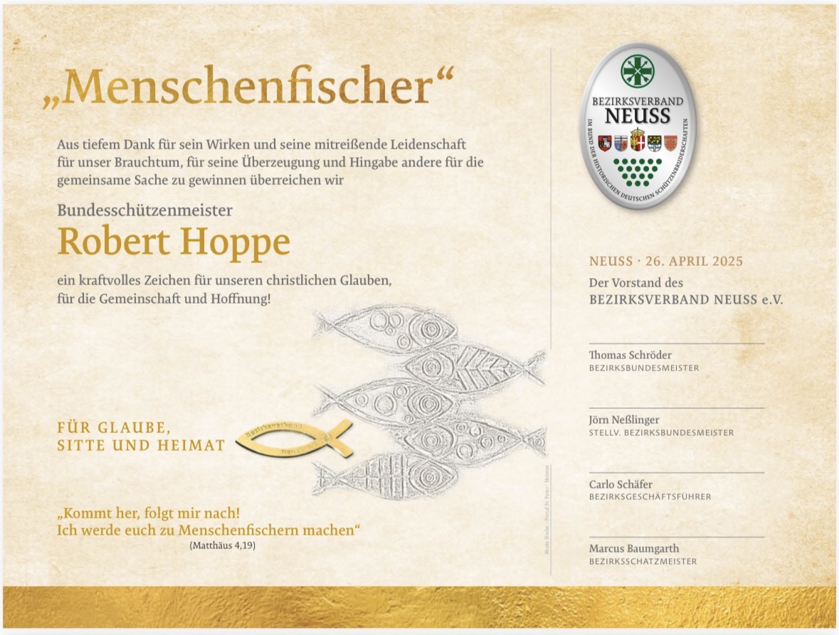 Der Bezirksverband Neuss hat in seinem Jubiläumsjahr seinen “Fisch” (Anstecker) als äußeres Zeichnen der Christen weiterentwickelt. Wir zeichnen damit verdiente Schützen und Gruppen aus, die sich im besonderen Maße für unser Brauchtum, für die Überzeugung und Hingabe andere für unsere gemeinsame Sache zu gewinnen aus. Der goldene Fisch soll ein kraftvolles Zeichen für unseren christilichen Glauben, für die Gemeinschaft und Hoffnung sein. Neben der goldenen Nadel wird der Titel “Menschenfischer”, dokumentiert mit einer Urkunde an den oder die Ausgezeichneten übergeben. Sie dürfen ab sofort den Titel “Menschenfischer” führen. Im April anlässlich des Festaktes zum Jubiläum wurde bereits Bundesschützenmeister Robert Hoppe und leitender Oberpfarrer Andras Süß mit dem Fisch ausgezeichnet. Zum nun folgenden Bezirkskönigsehrenabend konnte den beiden nun auch die dazu gehörige Urkunde und Titel übergeben werden. Eine besondere Überraschung hatte der Bezirksvorstand noch für seinen Bezirksbundesmeister Thomas Schröder und den Ehrenbezirksbundesmeister Andreas Kaiser bereit, der sich auch um die Organisation des Bezirksschützenfestes in Norf maßgeblich verdient gemacht hatte: Sie erhielten ebenfalls beide den goldenen Fisch samt Urkunde und Titel für ihre Wirken als Menschenfischer. Die Überraschung war gelungen!
