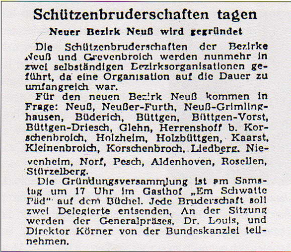 Bezirksbundesmeister Thomas Schröder hat zu diesem Anlass noch einmal den Artikel herausgesucht, mit dem seinerzeit die NGZ auf die Gründung hingewiesen hatte, die zugleich die Bruderschaften in der Region den beiden fortan selbstständigen Bezirksverbänden Neuss und Grevenbroich zuordnete. Das 75-Jährige des Verbandes hat das ausklingende Jahr in besonderer Weise geprägt, weil nicht zuletzt nach längerer Pause wieder ein Bezirksschützenfest gefeiert wurde, das im September in Neuss stattfand. Nun folgt der Schlussakkord. Er beginnt am Dienstag um 18 Uhr mit dem gemeinsamen Gottesdienstbesuch, zu dem man sich nicht in St. Quirin, sondern in der St.-Sebastianus-Kirche an der Niederstraße trifft. Von dort ist es nur ein Katzensprung bis zum „Schwatte Päd“, wo der Abend mit einem rustikalen Imbiss ausklingen wird.